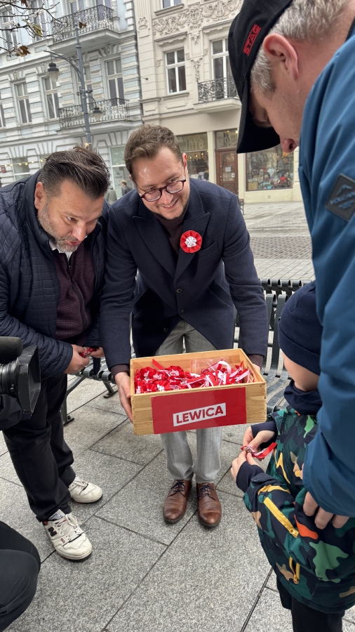 "Szanowni Państwo, jesteśmy dokładnie w przededniu rocznicy odzyskania przez Polskę niepodległości. Bardzo ważne święto, święto wszystkich obywateli, bez względu na to, czy są zwolennikami lewicy, prawicy, święto nas wszystkich. Dlatego dzisiaj z okazji tego święta będziemy rozdawać mieszkańcom Łodzi kotyliony, żeby jutro dumnie ten kotylion przyczepili sobie do kurtki, do marynarki, do swetra i dumnie pokazywali, że Polska jest niepodległym krajem". - mówił Tomasz Trela, Poseł Na Sejm RP.